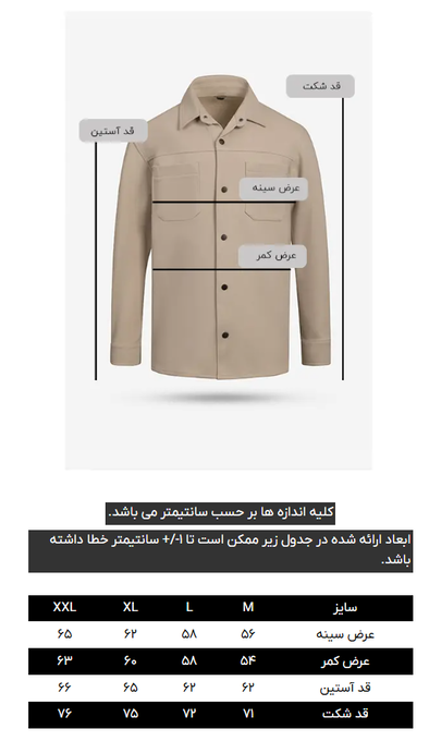شکت مردانه آستین بلند، دارای دو جیب روی سینه و دو جیب در بغل، آستین تک دکمه، ثبات رنگ در شستشو