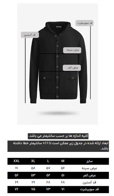 سوییشرت مردانه کلاه دار، بافته شده از الیاف پنبه و آکریلیک، دارای دو جیب دکمه دار، دارای زیپ و یک ردیف دکمه جهت مخفی کردن زیپ، دارای کشبافت در سر آستین ها و دور کمر