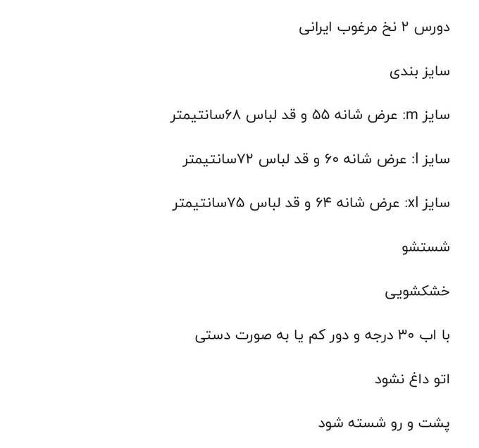 سایز xl: عرض شانه 64 و قد لباس 75سانتیمتر