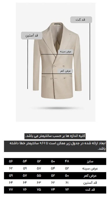 کت تک دبل برست، دو چاک در پشت،&;دارای جیب روی پیش سینه جهت استفاده از پوشت،&;داخل تمام آستر