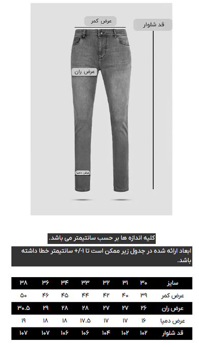 شلوار جین،&;پارچه تهیه شده از کتان،&;سنگ شور شده با&;آنزيم جهت ثبات رنگ،&;دارای جیب،&;دارای بند کمر جهت استفاده از کمربند