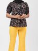 - بلوز زنانه آستین کوتاه کرپ حریر طرح دار یقه گرد آستین پفی کژوال افروز مشکی گلدار
