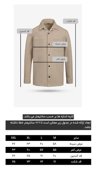 شکت آستین بلند، دارای دو جیب دکمه&;دار روی سینه و دو جیب در بغل، آستین تک دکمه، ثبات رنگ در شستشو