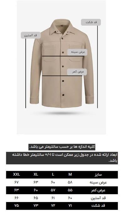 شکت آستین بلند، دارای دو جیب دکمه&;دار روی سینه و دو جیب در بغل، آستین تک دکمه، ثبات رنگ در شستشو