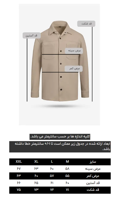 شکت آستین بلند، دارای دو جیب دکمه&;دار روی سینه و دو جیب در بغل، آستین تک دکمه، ثبات رنگ در شستشو