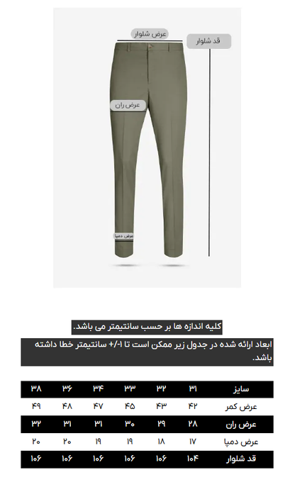 شلوار پارچه ای، پیش کار تک دکمه، دارای دکمه پرسی، دارای اسپاندکس جهت راحتی بیشتر