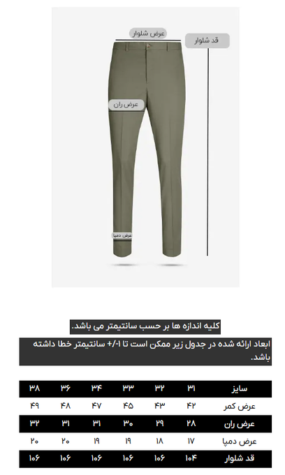 شلوار پارچه ای، پیش کار تک دکمه، دارای دکمه پرسی، دارای اسپاندکس جهت راحتی بیشتر