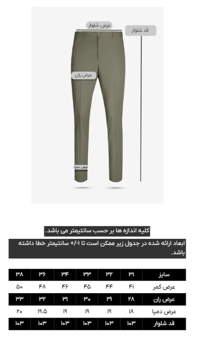 شلوار پارچه ای، دارای سگک ، تک پیله، پیش کار تک دکمه، دارای الاستین جهت راحتی بیشتر