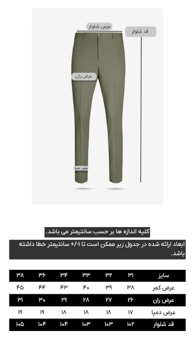 شلوار پارچه ای، پیش کار تک دکمه، دارای جیب ساعتی، دارای بند کمر جهت استفاده از کمربند، دارای الاستین جهت راحتی بیشتر
