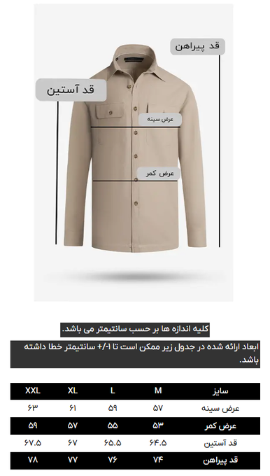 پیراهن آستین بلند،&;دارای دو جیب دکمه دار، پیش کار دکمه های پرچی،&;ثبات رنگ در شستشو