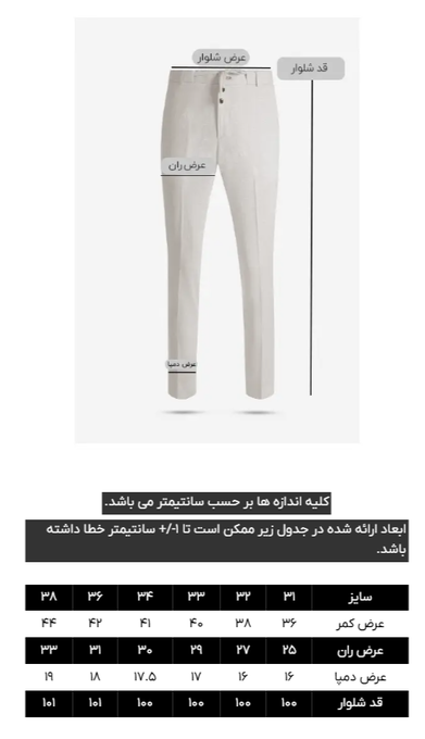 شلوار پارچه ای، پیش کار تک دکمه، دارای کمربند جهت فیت کردن دور کمر، دارای کشبافت در پشت کمر