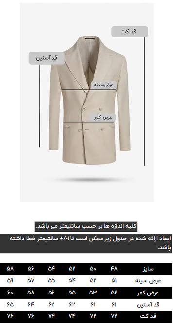 کت تک دبل برست، دو چاک در پشت،&;دارای دو جیب پاکتی و یک جیب روی پیش سینه جهت استفاده از پوشت،&;بدون آستر