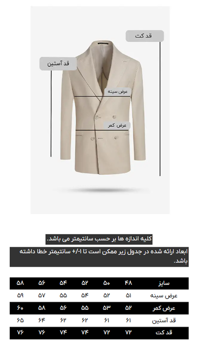 کت تک دبل برست، دو چاک در پشت،&;دارای دو جیب پاکتی و یک جیب روی پیش سینه جهت استفاده از پوشت،&;بدون آستر