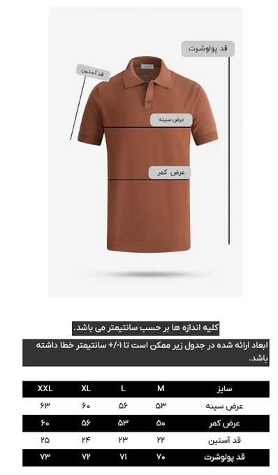 پولوشرت آستین کوتاه ، دارای کشبافت در یقه و سرآستین ها، دارای دو چاک در بغل، ثبات رنگ در شستشو