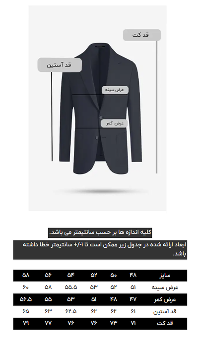 کت دو دکمه، دو&;چاک در پشت،&;دارای دو جیب پاکتی و یک جیب روی پیش سینه جهت استفاده از پوشت، بدون آستر
