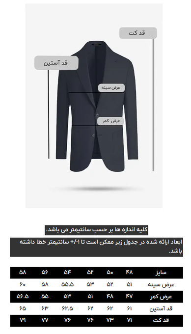کت دو دکمه، دو&;چاک در پشت،&;دارای دو جیب پاکتی و یک جیب روی پیش سینه جهت استفاده از پوشت، بدون آستر