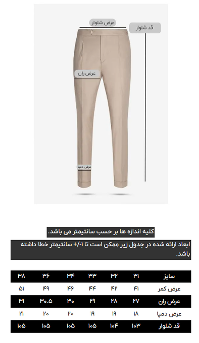 شلوار پارچه ای، دارای سگک، تک پیله، پیش کار تک دکمه، دارای بند کمر جهت استفاده از کمربند
