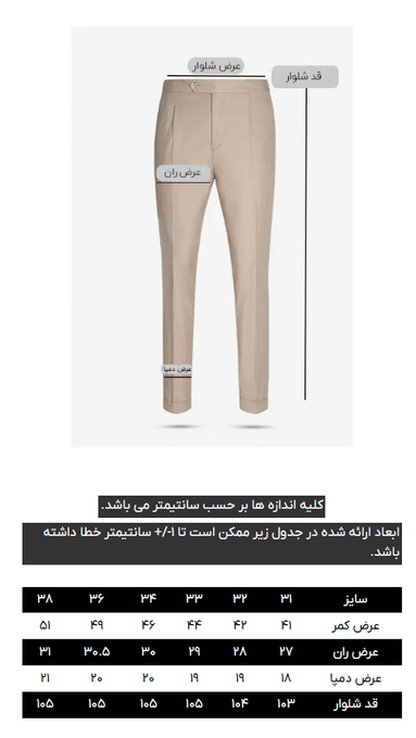شلوار پارچه ای، دارای سگک، تک پیله، پیش کار تک دکمه، دارای بند کمر جهت استفاده از کمربند