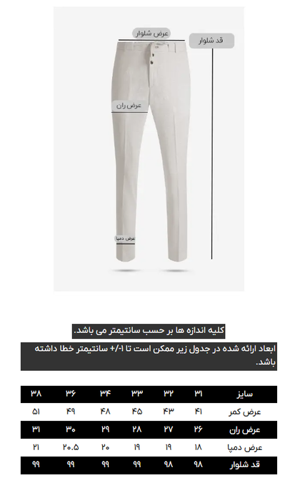 شلوار پارچه ای، پیش کار تک دکمه، دارای کمربند جهت فیت کردن دور کمر، دمپا دوبل پاکتی