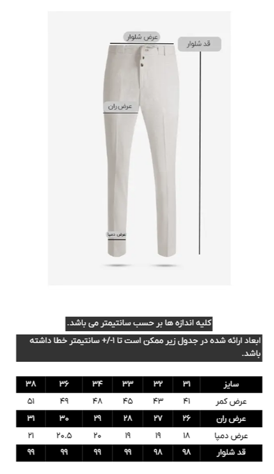 شلوار پارچه ای، پیش کار تک دکمه، دارای کمربند جهت فیت کردن دور کمر، دمپا دوبل پاکتی