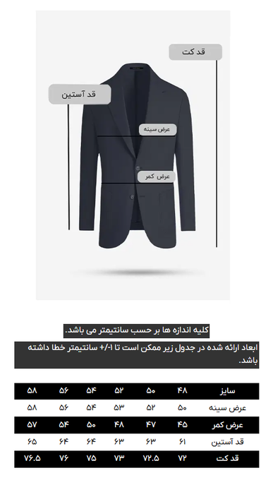 کت تک، دو&;چاک در پشت،&;دارای دو جیب پاکتی و یک جیب روی پیش سینه جهت استفاده از پوشت