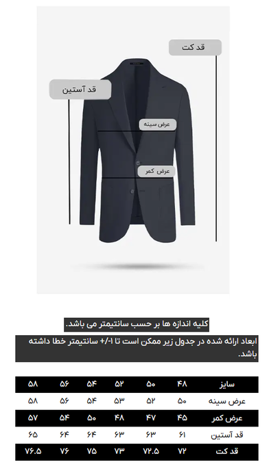 کت تک، دو&;چاک در پشت،&;دارای دو جیب پاکتی و یک جیب روی پیش سینه جهت استفاده از پوشت