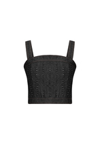 این تاپ با یقه مربعی و آستین کوتاه طراحی شده و بهدلیل استفاده از پارچه پلیاستر طرحدار با خامهدوزی، ظاهری خاص و چشمنواز دارد.