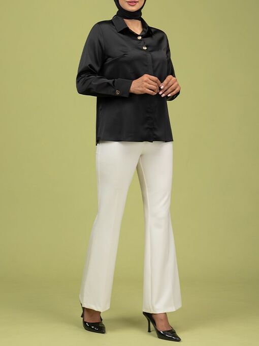 شومیز زنانه ساتن زارا یقه مردانه آستین بلند درای دکمه تزیینی مهناز مشکی