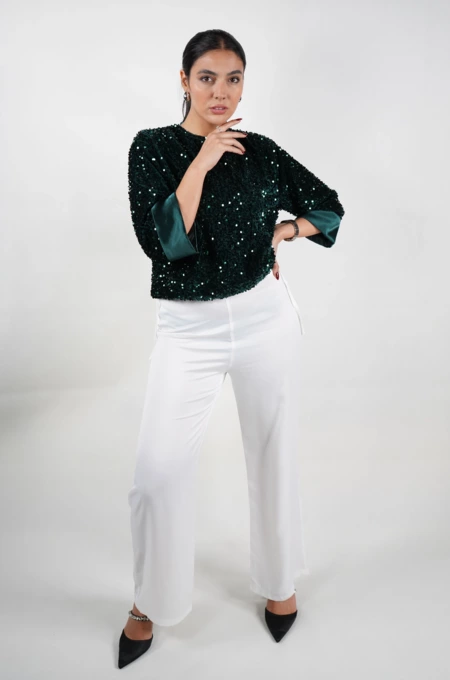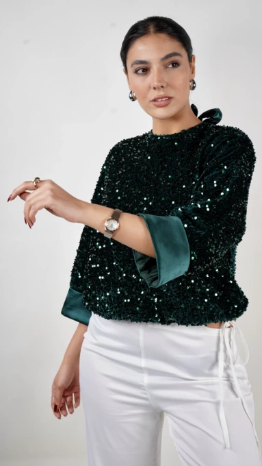 پارچه استفاده شده در این شومیز، پارچه مخمل پولکی است. شومیز آسترکشی شده و در قسمت پشت شومیز دو بند از پارچه ساتن قرار داردو