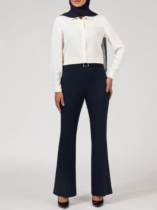 - شلوار زنانه کرپ دمپا گشاد کلاسیک دارای کمربند 10104 سرمه ای