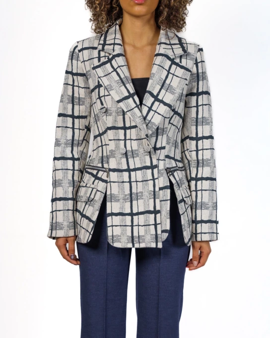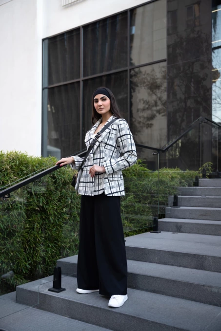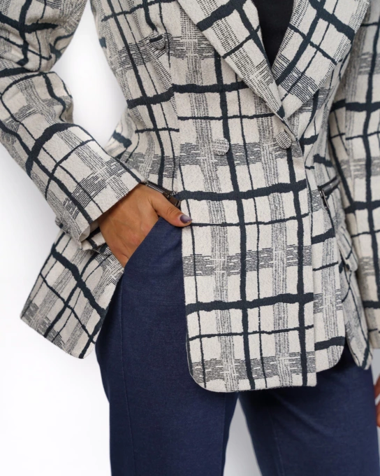 کت <> با تلفیقی از پارچهای با طرح کلاسیک و زیپ به عنوان یک المان مدرن، ترکیبی خاص و منحصربهفرد خلق کرده است.