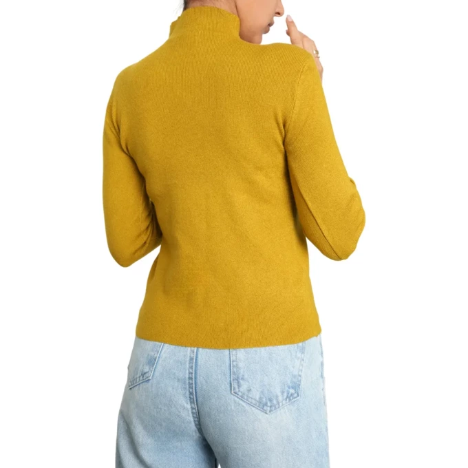 این پلیور زنانه از بافت نرم و لطیف تهیه شده و با یقه ایستاده خود بهخوبی از ناحیه گردن در برابر سرما محافظت میکند.