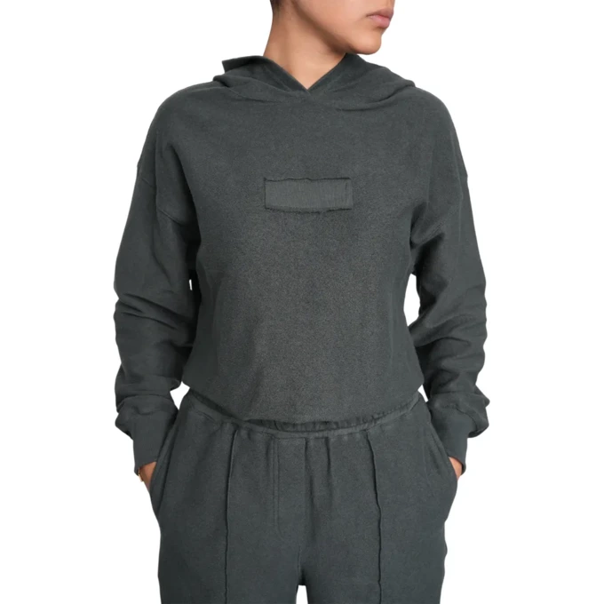 هودی این ست دارای طراحی کراپ کوتاه با تنخور فیت (متناسب) است که جلوهای جوانپسند و خوشفرم به استایل میدهد.