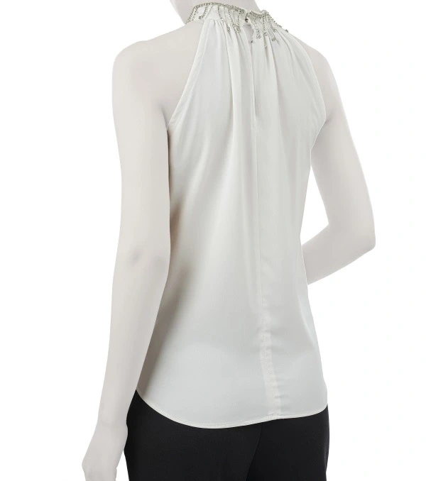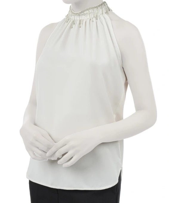 این تاپ با طراحی یقه ایستاده چیندار با تزئینات براق، جلوهای زنانه و جذاب به استایل شما میبخشد.