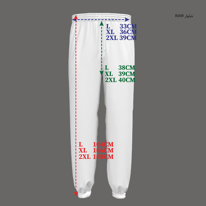 شلوار Raw دارای سه سایز L,XL,XXL میباشد که برای انتخاب سایز مناسب به راهنمای سایز موجود در گالری تصاویر محصول مراجعه کنید. دقت کنیدامکان خطای یک و یا دو سانتی متری اندازه گیری وجود دارد.جنس پارچه از دورس3نخ کرکی میباشد. برای شستشو از دمای اب 30 درجه و مایع لباسشویی استفاده کنید.سعی کنید هنگام شستشو لباس را پشت و رو کنید.