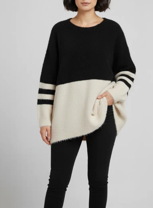 این پلیور با بافت دو رنگ جذاب طراحی شده و فرم آزاد و راحت آن باعث میشود برای استفاده روزمره، محل کار یا استایلهای کژوال کاملاً مناسب باشد.