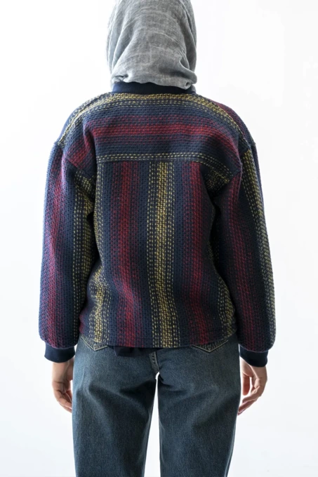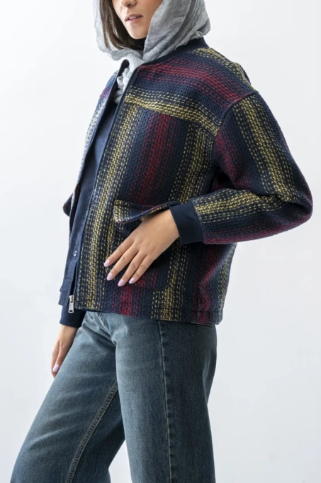 این کت تکرنگ با یقه کشبافت خلبانی طراحی شده که ظاهری اسپرت و جوانپسند به لباس میدهد.