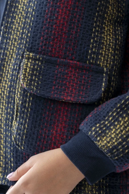 در قسمت پیش لباس، زیپ سراسری و دو جیب کاربردی بههمراه دریجیب تزئینی طراحی شده است که ضمن حفظ فرم لباس، جلوهای خاص و متفاوت ایجاد میکند.