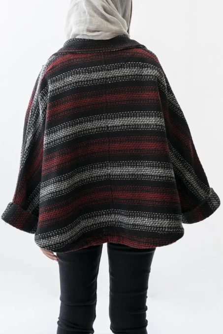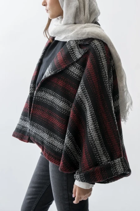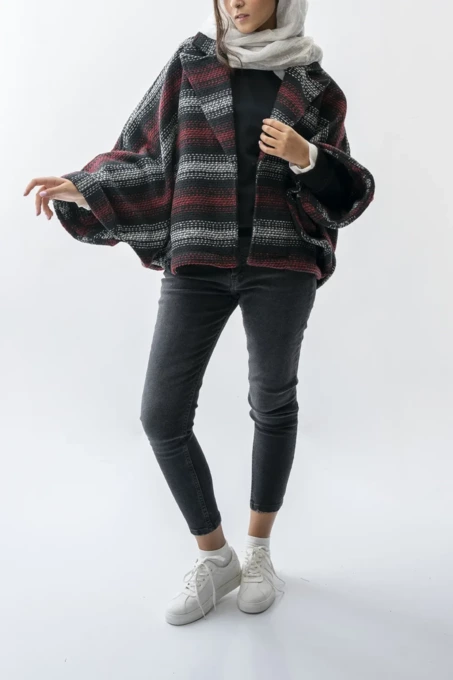 این پالتو فریسایز با جنس پارچه ژاکارد طرح گلیم و الیاف 100% پلیاستر تولید شده و ظاهری خاص و منحصربهفرد دارد.