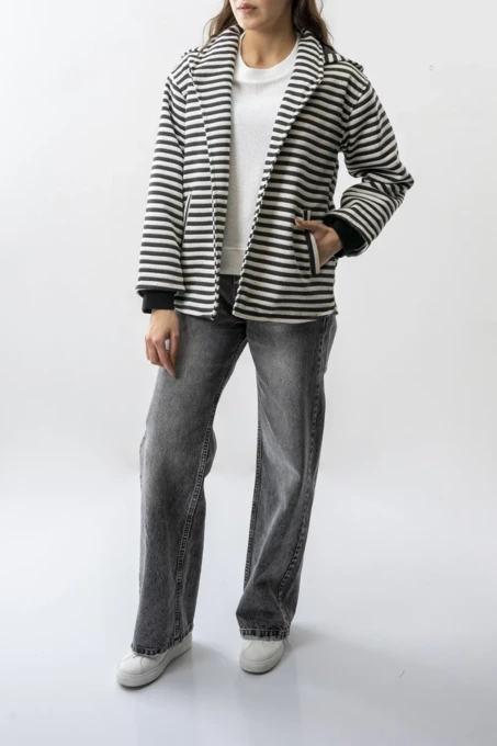 این کت راهراه کلاهدار در دو رنگ دودی و سورمهای عرضه شده و بهراحتی با شومیزها و بافتهای ظریف قابل ترکیب است.