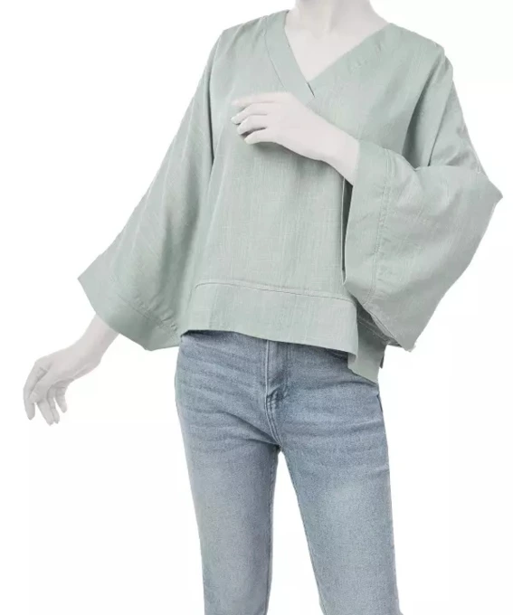 این شومیز از پارچه لینن نازک با تنخور آزاد و سرشانه افتاده تولید شده و با دو چاک کوتاه در کنارهها، آزادی حرکت بیشتری ایجاد میکند.