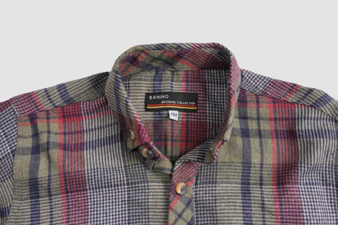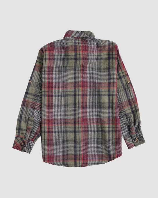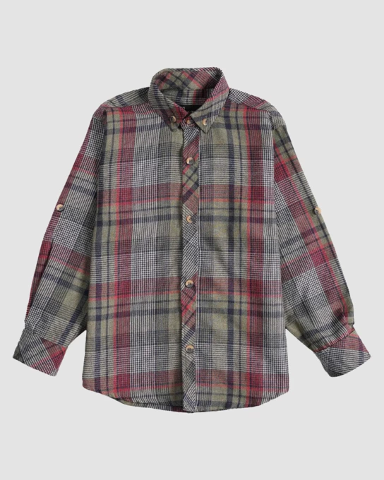 - پیراهن شومیزه پسرانه پارچه TT طرح چهارخانه سبز قرمز