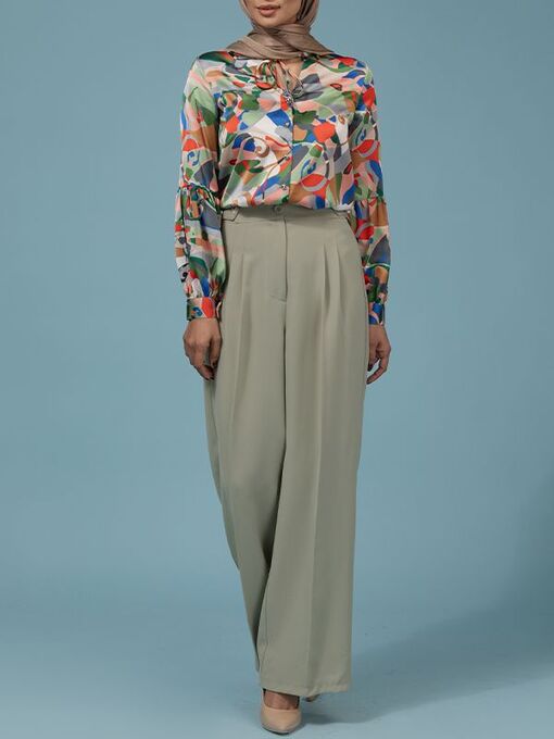 - شومیز زنانه ساتن طرحدار مجلسی یقه گره ای 30108 طوسی