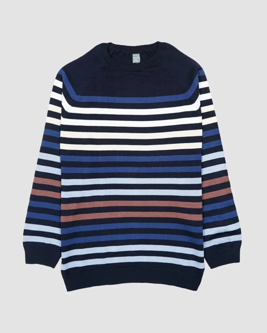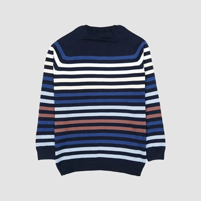 - پلیور بافت پسرانه بانی نو طرح یقه گرد راه راه سرمه ای