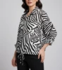 طراحی یقه مردانه و طرح شیک روی پارچه، جلوهای کلاسیک و منحصر به فرد به این شومیز داده است.