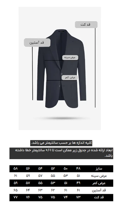 کت تک دو دکمه، دو&;چاک در پشت، دارای دو جیب قایقی روکار و&; جیب های داخلی و یک جیب روی سینه جهت استفاده از پوشت،&;طراحی به صورت بدون آستر